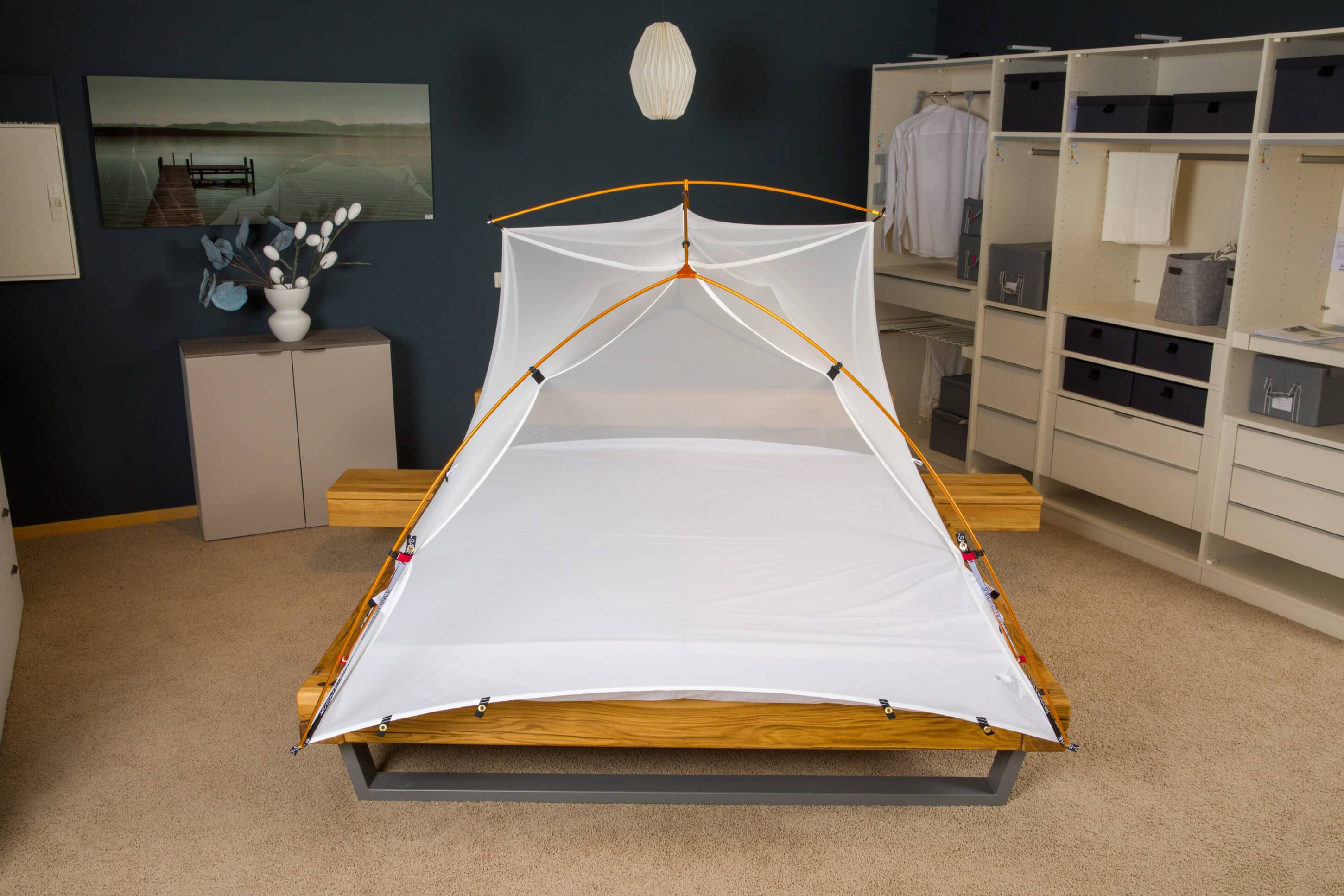 Das zum Patent angemeldete Konzept macht den MOSQUITO-SAFE in Länge und Breite variabel aufbaubar. Somit kannst du ihn optimal an die Abmaße des Bettes in deiner Unterkunft anpassen und verschenkst bei einem großen Bett keine ungenutze Grundfläche, noch gibt es Probleme beim Aufstellen des MOSQUITO-SAFE auf einem kleinen Einzelbett.
